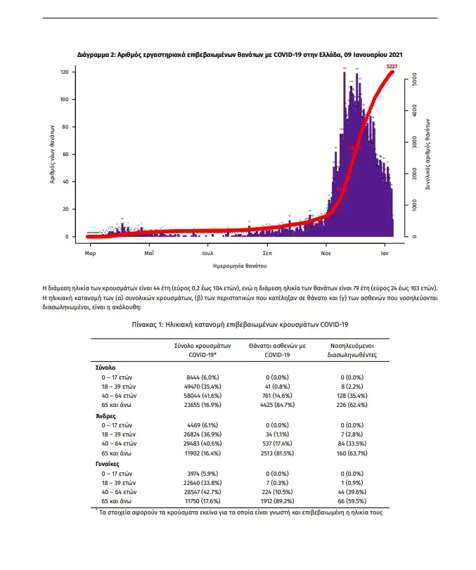 Τέλος, έχουμε 32 νέους θανάτους από τη νόσο COVID-19, φθάνοντας τους 5227 θανάτους συνολικά στη χώρα, εκ των οποίων 3087 (59.1%) άνδρες. Η διάμεση ηλικία των θανόντων συμπολιτών μας ήταν τα 79 έτη και το 95.5% είχε κάποιο υποκείμενο νόσημα ή/και ηλικία 70 ετών και άνω.