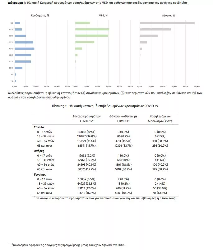 Ο αριθμός των ασθενών που νοσηλεύονται διασωληνωμένοι είναι 392 (63.4% άνδρες). Η διάμεση ηλικία τους είναι 67 έτη. To 86.5% έχει υποκείμενο νόσημα ή/και ηλικία 70 ετών και άνω. Από την αρχή της πανδημίας έχουν εξέλθει από τις ΜΕΘ 2.510 ασθενείς. Οι εισαγωγές2 νέων ασθενών Covid-19 στα νοσοκομεία της επικράτειας είναι 129 (ημερήσια μεταβολή -22.29%). Ο μέσος όρος εισαγωγών του επταημέρου είναι 159 ασθενείς.Η διάμεση ηλικία των κρουσμάτων είναι 43 έτη (εύρος 0.2 έως 106 έτη), ενώ η διάμεση ηλικία των θανόντων είναι 78 έτη (εύρος 0.2 έως 106 έτη).