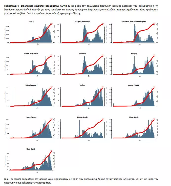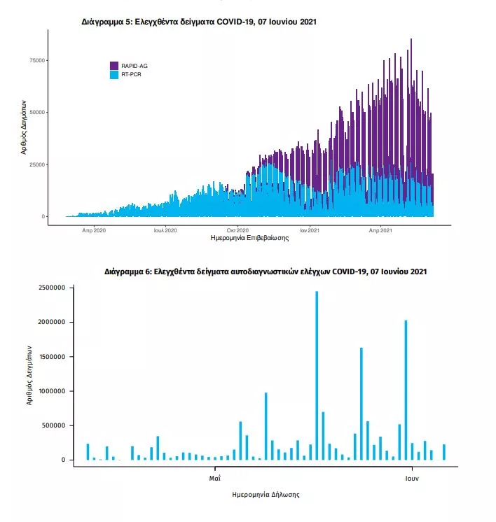 Δείγματα που έχουν ελεγχθεί: Από την 1η Ιανουαρίου 2020 μέχρι σήμερα, στα εργαστήρια που διενεργούν ελέγχους για τον νέο κορωνοϊό (SARS-CoV-2) και που δηλώνουν συστηματικά το σύνολο των δειγμάτων που ελέγχουν, έχουν συνολικά ελεγχθεί 5.159.892 κλινικά δείγματα ενώ από Μονάδες Υγείας και Κλιμάκια του ΕΟΔΥ που διενεργούν ελέγχους Rapid Ag έχουν ελεγχθεί 4.652.576 δείγματα. O μέσος όρος του επταημέρου είναι 41.700 δειγματοληπτικοί έλεγχοι.