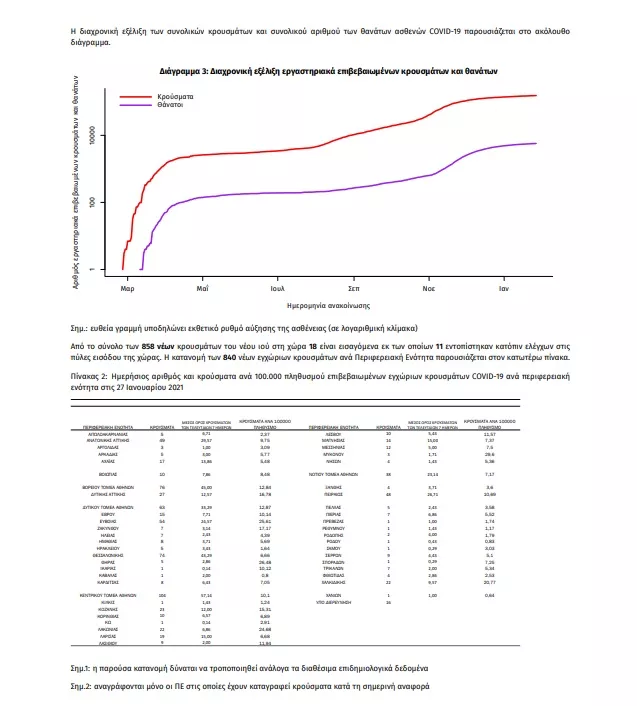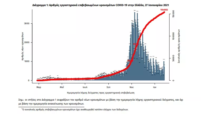 Τα στοιχεία που παρουσιάζονται αφορούν περιστατικά από την επιδημιολογική επιτήρηση της νόσου από το νέο κορωνοϊό (COVID19), με βάση τα δεδομένα που έχουν δηλωθεί στον ΕΟΔΥ και καταγραφεί μέχρι τις 27 Ιανουαρίου 2021 (ώρα 15:00). Τα νέα εργαστηριακά επιβεβαιωμένα κρούσματα της νόσου είναι 858, εκ των οποίων 11 εντοπίστηκαν κατόπιν ελέγχων στις πύλες εισόδου της χώρας. Ο συνολικός αριθμός των κρουσμάτων ανέρχεται σε 154083 (ημερήσια μεταβολή +0.6%), εκ των οποίων 52.1% άνδρες. 1 Οι νέοι θάνατοι ασθενών με COVID-19 είναι 32, ενώ από την έναρξη της επιδημίας έχουν καταγραφεί συνολικά 5724 θάνατοι. Η διάμεση ηλικία των ασθενών που απεβίωσαν είναι 79 έτη. Ο αριθμός των ασθενών που νοσηλεύονται διασωληνωμένοι είναι 274 (70.8% άνδρες). To 𝑅𝑡 για την επικράτεια εκτιμάται σε 0.88 (95%Crl: 0.28-1.41) Η ημερήσια κατανομή των επιβεβαιωμένων κρουσμάτων είναι η ακόλουθη (η γραμμή παριστάνει την συνολική, αθροιστική κατανομή των κρουσμάτων).