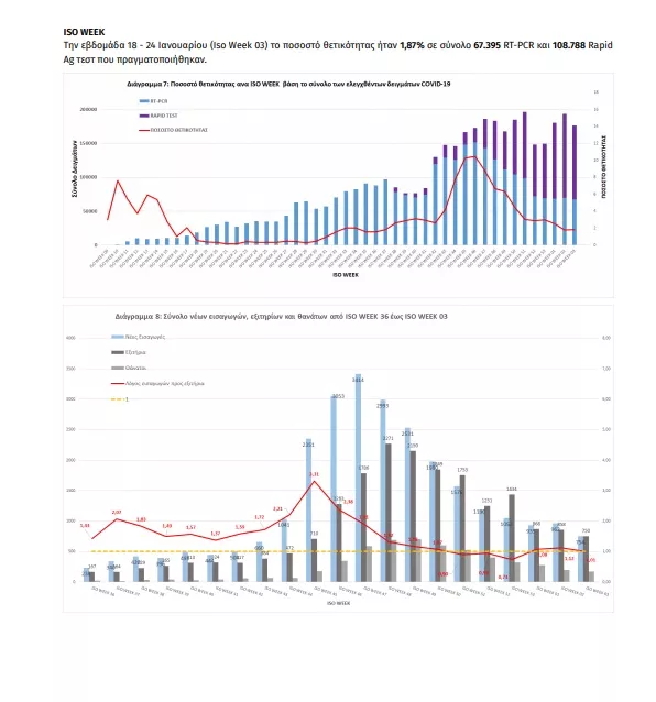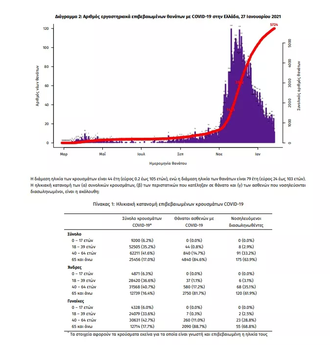 Τέλος, έχουμε 32 νέους θανάτους από τη νόσο COVID-19, φθάνοντας τους 5724 θανάτους συνολικά στη χώρα, εκ των οποίων 3367 (58.8%) άνδρες. Η διάμεση ηλικία των θανόντων συμπολιτών μας ήταν τα 79 έτη και το 95.4% είχε κάποιο υποκείμενο νόσημα ή/και ηλικία 70 ετών και άνω.