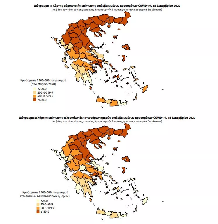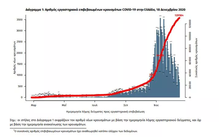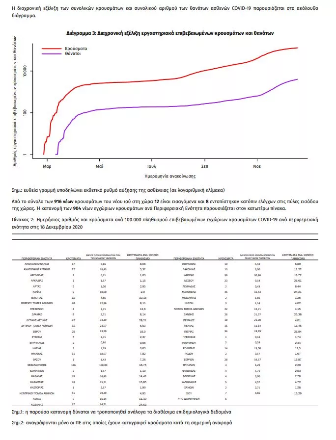 Τα στοιχεία που παρουσιάζονται αφορούν περιστατικά από την επιδημιολογική επιτήρηση της νόσου από το νέο κορωνοϊό (COVID19), με βάση τα δεδομένα που έχουν δηλωθεί στον ΕΟΔΥ και καταγραφεί μέχρι τις 18 Δεκεμβρίου 2020 (ώρα 15:00).Τα νέα εργαστηριακά επιβεβαιωμένα κρούσματα της νόσου είναι 916, εκ των οποίων 8 εντοπίστηκαν κατόπιν ελέγχων στις πύλες εισόδου της χώρας. Ο συνολικός αριθμός των κρουσμάτων ανέρχεται σε 129584 (ημερήσια μεταβολή +0.7%), εκ των οποίων 52.5% άνδρες. 1 Οι νέοι θάνατοι ασθενών με COVID-19 είναι 96, ενώ από την έναρξη της επιδημίας έχουν καταγραφεί συνολικά 4044 θάνατοι. Η διάμεση ηλικία των ασθενών που απεβίωσαν είναι 79 έτη. Ο αριθμός των ασθενών που νοσηλεύονται διασωληνωμένοι