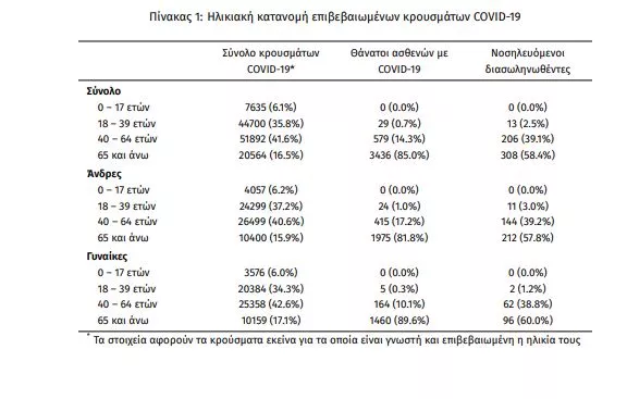 Η διάμεση ηλικία των κρουσμάτων είναι 44 έτη (εύρος 0.2 έως 104 ετών), ενώ η διάμεση ηλικία των θανάτων είναι 79 έτη (εύρος 25 έως 103 ετών). Η ηλικιακή κατανομή των (α) συνολικών κρουσμάτων, (β) των περιστατικών που κατέληξαν σε θάνατο και (γ) των ασθενών που νοσηλεύονται διασωληνωμένοι, είναι η ακόλουθη: