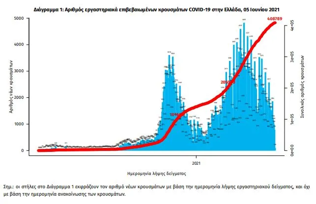 Δείγματα που έχουν ελεγχθεί: Από την 1η Ιανουαρίου 2020 μέχρι σήμερα, στα εργαστήρια που διενεργούν ελέγχους για τον νέο κορωνοϊό (SARS-CoV-2) και που δηλώνουν συστηματικά το σύνολο των δειγμάτων που ελέγχουν, έχουν συνολικά ελεγχθεί 5.147.883 κλινικά δείγματα ενώ από Μονάδες Υγείας και Κλιμάκια του ΕΟΔΥ που διενεργούν ελέγχους Rapid Ag έχουν ελεγχθεί 4.623.377 δείγματα. O μέσος όρος του επταημέρου είναι 41.922 δειγματοληπτικοί έλεγχοι.