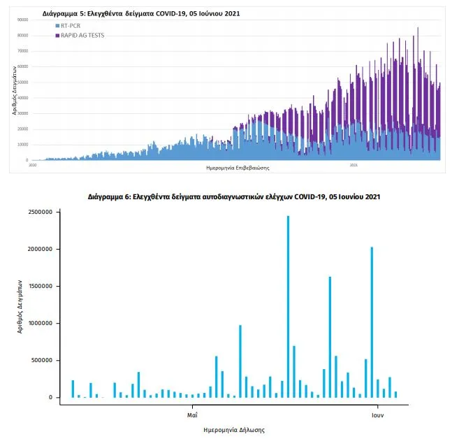 Αυτοδιαγνωστικοί έλεγχοι (Self-tests): Έως 04 Ιουνίου 2021, έχουν καταγραφεί ηλεκτρονικά 15.830.491 δηλώσεις αποτελέσματος αυτοδιαγνωστικού ελέγχου, ενώ 315.197 άτομα προσήλθαν για επανέλεγχο.