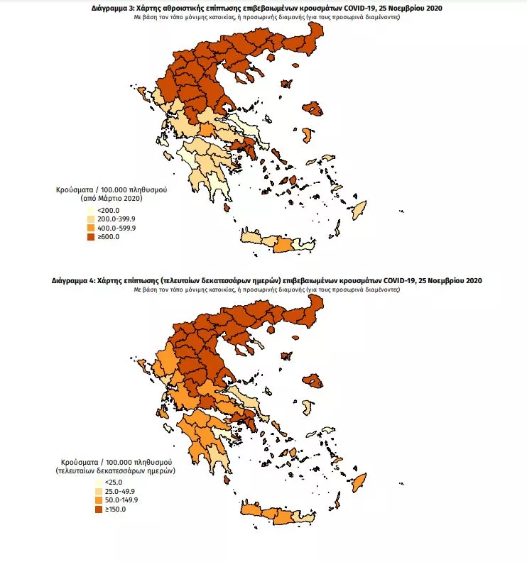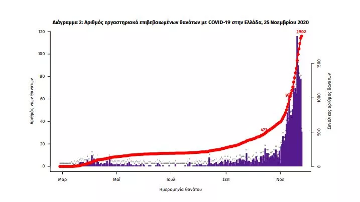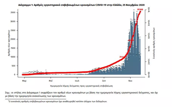 Τα στοιχεία που παρουσιάζονται αφορούν περιστατικά από την επιδημιολογική επιτήρηση της νόσου από το νέο κορωνοϊό (COVID19), με βάση τα δεδομένα που έχουν δηλωθεί στον ΕΟΔΥ και καταγραφεί μέχρι τις 25 Νοεμβρίου 2020 (ώρα 15:00). Τα νέα εργαστηριακά επιβεβαιωμένα κρούσματα της νόσου είναι 2152, εκ των οποίων 6 εντοπίστηκαν κατόπιν ελέγχων στις πύλες εισόδου της χώρας. Ο συνολικός αριθμός των κρουσμάτων ανέρχεται σε 97288 (ημερήσια μεταβολή +2.3%), εκ των οποίων 53.2% άνδρες. 1 Οι νέοι θάνατοι ασθενών με COVID-19 είναι 87, ενώ από την έναρξη της επιδημίας έχουν καταγραφεί συνολικά 1902 θάνατοι.Η διάμεση ηλικία των ασθενών που απεβίωσαν είναι 80 έτη. Ο αριθμός των ασθενών που νοσηλεύονται διασωληνωμένοι είναι 597 (71.5% άνδρες). Η ημερήσια κατανομή των επιβεβαιωμένων κρουσμάτων είναι η ακόλουθη (η γραμμή παριστάνει την συνολική, αθροιστική κατανομή των κρουσμάτων).