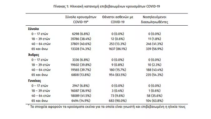 Τέλος, έχουμε 87 ακόμα καταγεγραμμένους θανάτους και 1902 θανάτους συνολικά στη χώρα. 759 (39.9%) γυναίκες και οι υπόλοιποι άνδρες. Η διάμεση ηλικία των θανόντων συμπολιτών μας ήταν τα 80 έτη και το 97.1% είχε κάποιο υποκείμενο νόσημα ή/και ηλικία 70 ετών και άνω.