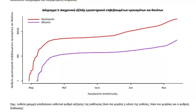 Η διαχρονική εξέλιξη των συνολικών κρουσμάτων και συνολικού αριθμού των θανάτων ασθενών COVID-19 παρουσιάζεται στο ακόλουθο διάγραμμα (σε λογαριθμική κλίμακα).