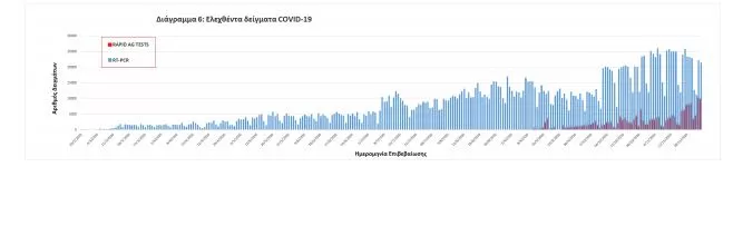Δείγματα που έχουν ελεγχθεί: Από την 1η Ιανουαρίου 2020 μέχρι σήμερα, στα εργαστήρια που διενεργούν ελέγχους για τον νέο κορωνοϊό (SARS-CoV-2) και που δηλώνουν συστηματικά στον ΕΟΔΥ το σύνολο των δειγμάτων που ελέγχουν, έχουν συνολικά ελεγχθεί 2290659 κλινικά δείγματα ενώ από Μονάδες Υγείας και Κλιμάκια του ΕΟΔΥ που διενεργούν ελέγχους Rapid Ag έχουν ελεγχθεί 176486 δείγματα.