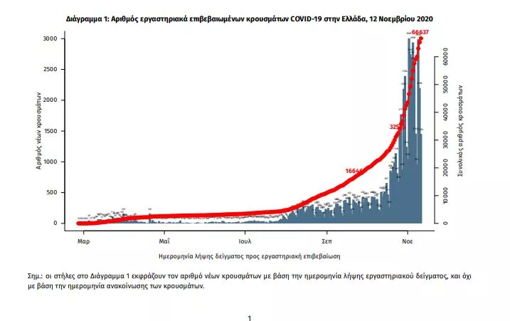 Τα στοιχεία που παρουσιάζονται αφορούν περιστατικά από την επιδημιολογική επιτήρηση της νόσου από το νέο κορωνοϊό (COVID19), με βάση τα δεδομένα που έχουν δηλωθεί στον ΕΟΔΥ και καταγραφεί μέχρι τις 12 Νοεμβρίου 2020 (ώρα 15:00). Τα νέα εργαστηριακά επιβεβαιωμένα κρούσματα της νόσου είναι 3316, εκ των οποίων 24 εντοπίστηκαν κατόπιν ελέγχων στις πύλες εισόδου της χώρας. Ο συνολικός αριθμός των κρουσμάτων ανέρχεται σε 66637 (ημερήσια μεταβολή +5.2%), εκ των οποίων 54.1% άνδρες. Οι νέοι θάνατοι ασθενών με COVID-19 είναι 50, ενώ από την έναρξη της επιδημίας έχουν καταγραφεί συνολικά 959 θάνατοι.Η διάμεση ηλικία των ασθενών που απεβίωσαν είναι 80 έτη. Ο αριθμός των ασθενών που νοσηλεύονται διασωληνωμένοι είναι 310 (71.6% άνδρες). Η ημερήσια κατανομή των επιβεβαιωμένων κρουσμάτων είναι η ακόλουθη (η γραμμή παριστάνει την συνολική, αθροιστική