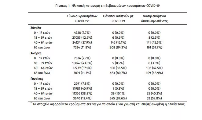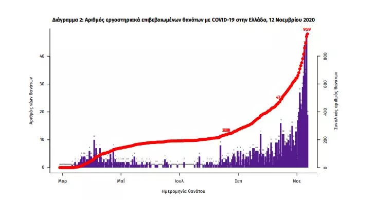 Τέλος, έχουμε 50 ακόμα καταγεγραμμένους θανάτους και 959 θανάτους συνολικά στη χώρα. 387 (40.4%) γυναίκες και οι υπόλοιποι άνδρες. Η διάμεση ηλικία των θανόντων συμπολιτών μας ήταν τα 80 έτη και το 96.9% είχε κάποιο υποκείμενο νόσημα ή/και ηλικία 70 ετών και άνω.