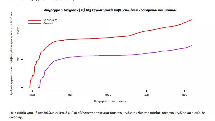 Η διαχρονική εξέλιξη των συνολικών κρουσμάτων και συνολικού αριθμού των θανάτων ασθενών COVID-19 παρουσιάζεται στο ακόλουθο διάγραμμα (σε λογαριθμική κλίμακα).