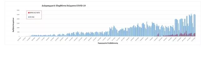 Δείγματα που έχουν ελεγχθεί: Από την 1η Ιανουαρίου 2020 μέχρι σήμερα, στα εργαστήρια που διενεργούν ελέγχους για τον νέο κορωνοϊό (SARS-CoV-2) και που δηλώνουν συστηματικά στον ΕΟΔΥ το σύνολο των δειγμάτων που ελέγχουν, έχουν συνολικά ελεγχθεί 2028196 κλινικά δείγματα ενώ από Μονάδες Υγείας και Κλιμάκια του ΕΟΔΥ που διενεργούν ελέγχους Rapid Ag έχουν ελεγχθεί 102369 δείγματα.