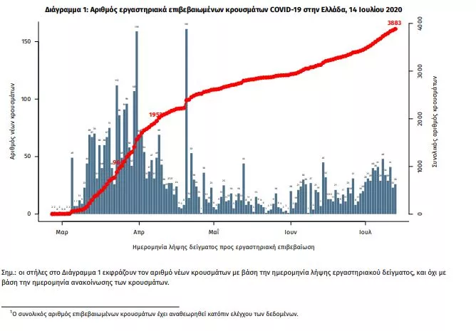 Τα στοιχεία που παρουσιάζονται αφορούν περιστατικά από την επιδημιολογική επιτήρηση της νόσου από το νέο κορωνοϊό (COVID19), με βάση τα δεδομένα που έχουν δηλωθεί στον ΕΟΔΥ και καταγραφεί μέχρι τις 14 Ιουλίου 2020 (ώρα 15:00).Τα νέα εργαστηριακά επιβεβαιωμένα κρούσματα της νόσου είναι 58, εκ των οποίων τα 28 εντοπίστηκαν κατόπιν ελέγχων στις πύλες εισόδου τις χώρας. Ο συνολικός αριθμός των κρουσμάτων ανέρχεται σε 3883 (ημερήσια μεταβολή +1.5%), εκ των οποίων 54.7% άνδρες.