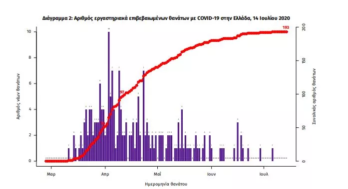 Δεν έχει καταγραφεί κανένας νέος θάνατος ασθενούς με COVID-19, ενώ από την έναρξη της επιδημίας έχουν καταγραφεί συνολικά 193 θάνατοι. Η μέση ηλικία των ασθενών που απεβίωσαν είναι 76 έτη. Ο αριθμός των ασθενών που νοσηλεύονται διασωληνωμένοι είναι 13 (76.9% άνδρες). Η ημερήσια κατανομή των επιβεβαιωμένων κρουσμάτων είναι η ακόλουθη (η γραμμή παριστάνει την συνολική, αθροιστική κατανομή των κρουσμάτων).