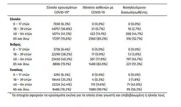Η διάμεση ηλικία των ασθενών που απεβίωσαν είναι 79 έτη. Ο αριθμός των ασθενών που νοσηλεύονται διασωληνωμένοι είναι 600 (71.8% άνδρες).