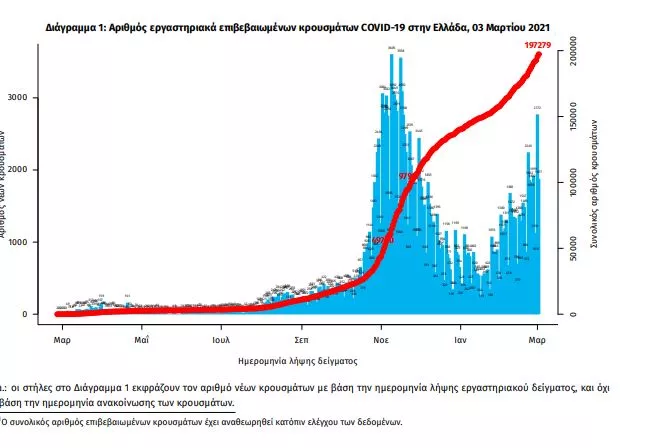 Τα νέα εργαστηριακά επιβεβαιωμένα κρούσματα της νόσου που καταγράφηκαν τις τελευταίες 24 ώρες είναι 2702. Εκ των οποίων 20 εντοπίστηκαν κατόπιν ελέγχων στις πύλες εισόδου της χώρας. Ο συνολικός αριθμός των κρουσμάτων ανέρχεται σε 197.279 (ημερήσια μεταβολή +1.4%), εκ των οποίων 51.7% άνδρες. 1 Με βάση τα επιβεβαιωμένα κρούσματα των τελευταίων 7 ημερών, 63