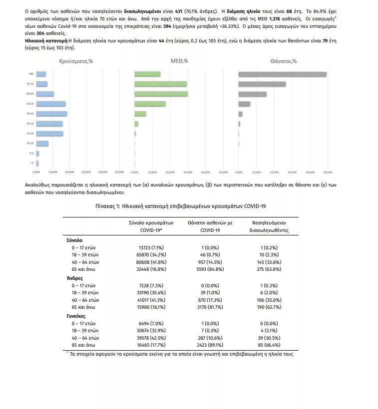 Ο αριθμός των ασθενών που νοσηλεύονται διασωληνωμένοι είναι 431 (70.1% άνδρες). Η διάμεση ηλικία τους είναι 68 έτη. To 84.9% έχει υποκείμενο νόσημα ή/και ηλικία 70 ετών και άνω. Από την αρχή της πανδημίας έχουν εξέλθει από τις ΜΕΘ 1.376 ασθενείς. Οι εισαγωγές2 νέων ασθενών Covid-19 στα νοσοκομεία της επικράτειας είναι 394 (ημερήσια μεταβολή +36.33%). Ο μέσος όρος εισαγωγών του επταημέρου είναι 304 ασθενείς. Hλικιακή κατανομή:Η διάμεση ηλικία των κρουσμάτων είναι 44 έτη (εύρος 0.2 έως 105 έτη), ενώ η διάμεση ηλικία των θανόντων είναι 79 έτη (εύρος 15 έως 103 έτη).