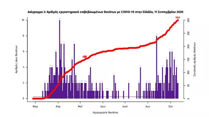 Οι νέοι θάνατοι ασθενών με COVID-19 είναι 3, ενώ από την έναρξη της επιδημίας έχουν καταγραφεί συνολικά 300 θάνατοι. Η διάμεση ηλικία των ασθενών που απεβίωσαν είναι 78 έτη. Ο αριθμός των ασθενών που νοσηλεύονται διασωληνωμένοι είναι 52 (78.8% άνδρες). Η ημερήσια κατανομή των επιβεβαιωμένων κρουσμάτων είναι η ακόλουθη (η γραμμή παριστάνει την συνολική, αθροιστική