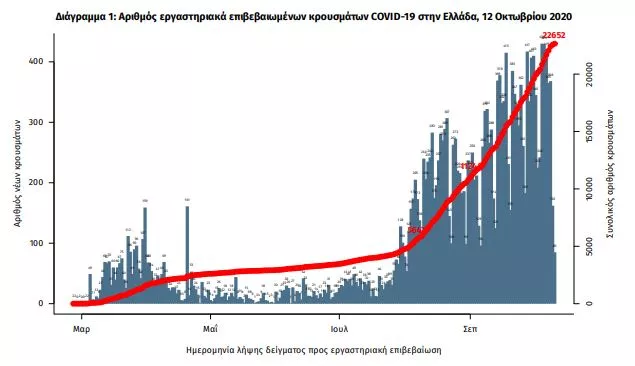 Τα νέα εργαστηριακά επιβεβαιωμένα κρούσματα της νόσου είναι 295, εκ των οποίων 48 συνδέονται με γνωστές συρροές και 40 εντοπίστηκαν κατόπιν ελέγχων στις πύλες εισόδου της χώρας. Ο συνολικός αριθμός των κρουσμάτων ανέρχεται σε 22652 (ημερήσια μεταβολή +1.3%), εκ των οποίων 55.7% άνδρες.