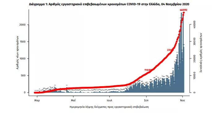 Τα νέα εργαστηριακά επιβεβαιωμένα κρούσματα της νόσου είναι 2646, εκ των οποίων 42 εντοπίστηκαν κατόπιν ελέγχων στις πύλες εισόδου της χώρας.