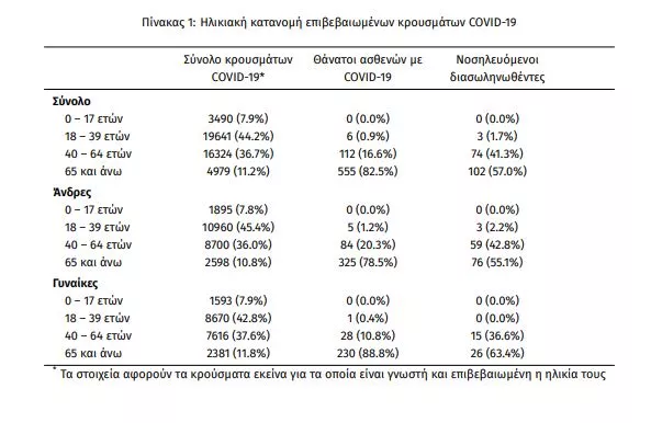 Η ηλικιακή κατανομή των (α) συνολικών κρουσμάτων, (β) των περιστατικών που κατέληξαν σε θάνατο και (γ) των ασθενών που νοσηλεύονται διασωληνωμένοι, είναι η ακόλουθη:
