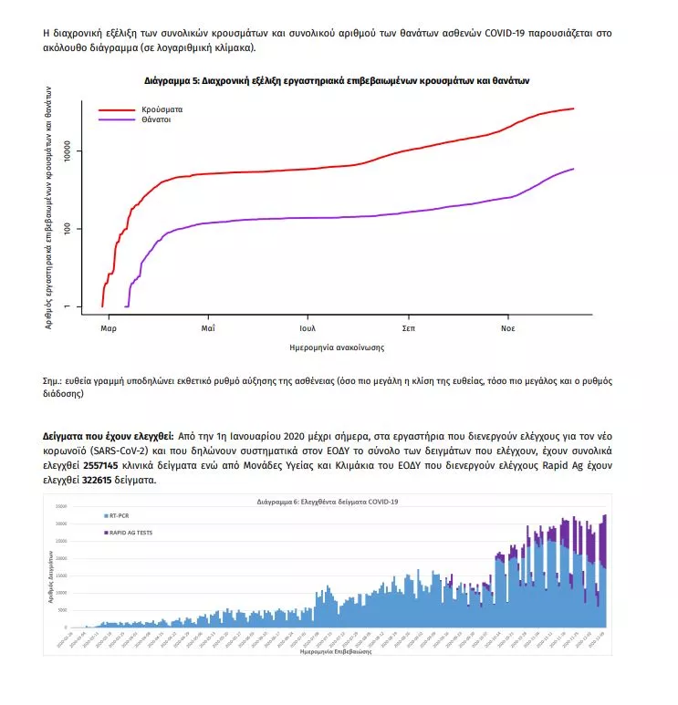 Τέλος, έχουμε 102 ακόμα καταγεγραμμένους θανάτους και 3472 θανάτους συνολικά στη χώρα. 1392 (40.1%) γυναίκες και οι υπόλοιποι άνδρες. Η διάμεση ηλικία των θανόντων συμπολιτών μας ήταν τα 79 έτη και το 96.0% είχε κάποιο υποκείμενο νόσημα ή/και ηλικία 70 ετών και άνω.