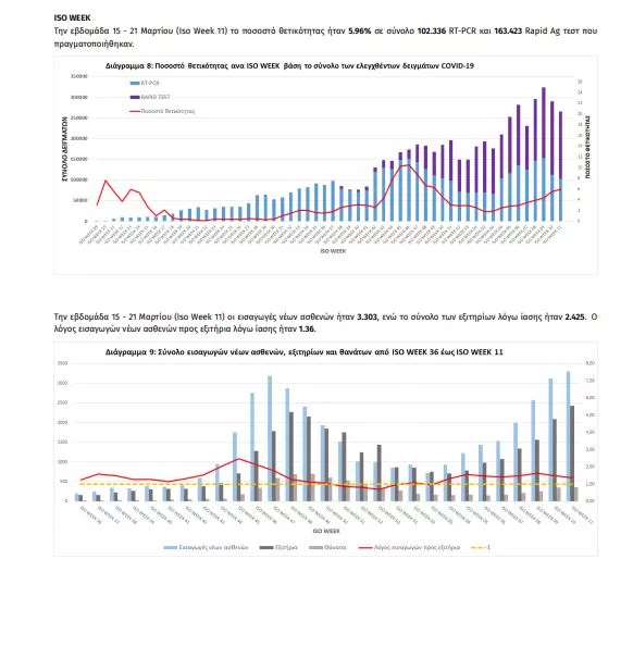 Την εβδομάδα 15 - 21 Μαρτίου (Iso Week 11) το ποσοστό θετικότητας ήταν 5.96% σε σύνολο 102.336 RT-PCR και 163.423 Rapid Ag τεστ που