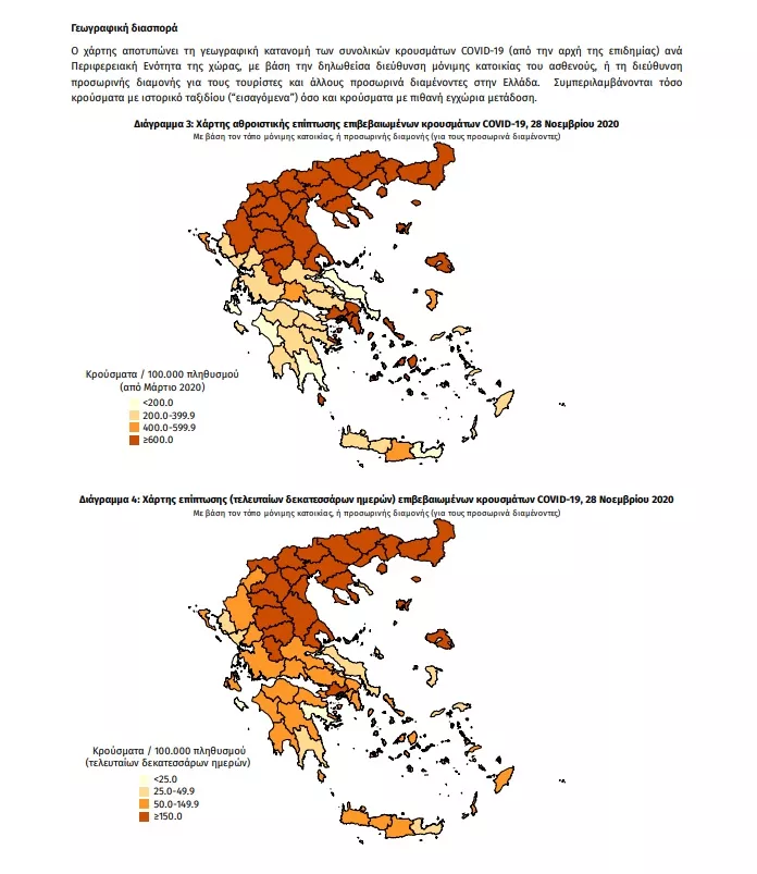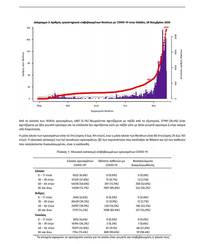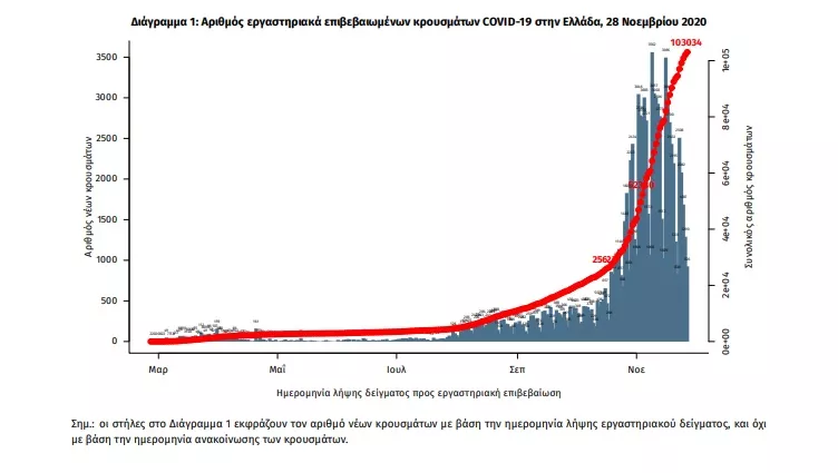 Τα στοιχεία που παρουσιάζονται αφορούν περιστατικά από την επιδημιολογική επιτήρηση της νόσου από το νέο κορωνοϊό (COVID19), με βάση τα δεδομένα που έχουν δηλωθεί στον ΕΟΔΥ και καταγραφεί μέχρι τις 28 Νοεμβρίου 2020 (ώρα 15:00). Τα νέα εργαστηριακά επιβεβαιωμένα κρούσματα της νόσου είναι 1747, εκ των οποίων 2 εντοπίστηκαν κατόπιν ελέγχων στις πύλες εισόδου της χώρας. Ο συνολικός αριθμός των κρουσμάτων ανέρχεται σε 103034 (ημερήσια μεταβολή +1.7%), εκ των οποίων 53.0% άνδρες. Οι νέοι θάνατοι ασθενών με COVID-19 είναι 121, ενώ από την έναρξη της επιδημίας έχουν καταγραφεί συνολικά 2223 θάνατοι.Η διάμεση ηλικία των ασθενών που απεβίωσαν είναι 80 έτη. Ο αριθμός των ασθενών που νοσηλεύονται διασωληνωμένοι είναι 606 (71.8% άνδρες). Η ημερήσια κατανομή των επιβεβαιωμένων κρουσμάτων είναι η ακόλουθη (η γραμμή παριστάνει την συνολική, αθροιστική κατανομή των κρουσμάτων).
