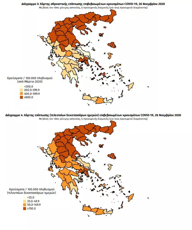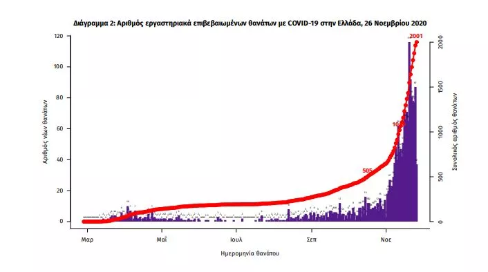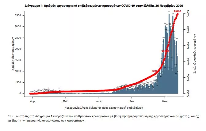 Τα στοιχεία που παρουσιάζονται αφορούν περιστατικά από την επιδημιολογική επιτήρηση της νόσου από το νέο κορωνοϊό (COVID19), με βάση τα δεδομένα που έχουν δηλωθεί στον ΕΟΔΥ και καταγραφεί μέχρι τις 26 Νοεμβρίου 2020 (ώρα 15:00).Τα νέα εργαστηριακά επιβεβαιωμένα κρούσματα της νόσου είναι 2018, εκ των οποίων 2 εντοπίστηκαν κατόπιν ελέγχων στις πύλες εισόδου της χώρας. Ο συνολικός αριθμός των κρουσμάτων ανέρχεται σε 99306 (ημερήσια μεταβολή +2.1%), εκ των οποίων 53.1% άνδρες. Οι νέοι θάνατοι ασθενών με COVID-19 είναι 99, ενώ από την έναρξη της επιδημίας έχουν καταγραφεί συνολικά 2001 θάνατοι.Η διάμεση ηλικία των ασθενών που απεβίωσαν είναι 80 έτη. Ο αριθμός των ασθενών που νοσηλεύονται διασωληνωμένοι είναι 608 (72.7% άνδρες). Η ημερήσια κατανομή των επιβεβαιωμένων κρουσμάτων είναι η ακόλουθη (η γραμμή παριστάνει την συνολική, αθροιστική