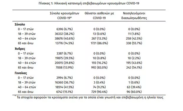 Τέλος, έχουμε 99 ακόμα καταγεγραμμένους θανάτους και 2001 θανάτους συνολικά στη χώρα. 806 (40.3%) γυναίκες και οι υπόλοιποι άνδρες. Η διάμεση ηλικία των θανόντων συμπολιτών μας ήταν τα 80 έτη και το 97.1% είχε κάποιο υποκείμενο νόσημα ή/και ηλικία 70 ετών και άνω.