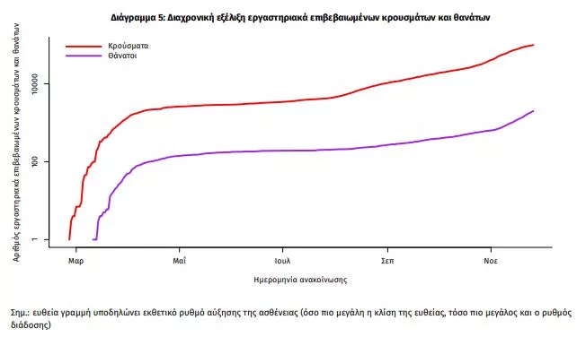 Η διαχρονική εξέλιξη των συνολικών κρουσμάτων και συνολικού αριθμού των θανάτων ασθενών COVID-19 παρουσιάζεται στο ακόλουθο διάγραμμα (σε λογαριθμική κλίμακα).