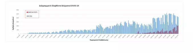 Δείγματα που έχουν ελεγχθεί: Από την 1η Ιανουαρίου 2020 μέχρι σήμερα, στα εργαστήρια που διενεργούν ελέγχους για τον νέο κορωνοϊό (SARS-CoV-2) και που δηλώνουν συστηματικά στον ΕΟΔΥ το σύνολο των δειγμάτων που ελέγχουν, έχουν συνολικά ελεγχθεί 2311870 κλινικά δείγματα ενώ από Μονάδες Υγείας και Κλιμάκια του ΕΟΔΥ που διενεργούν ελέγχους Rapid Ag έχουν ελεγχθεί 186793 δείγματα.