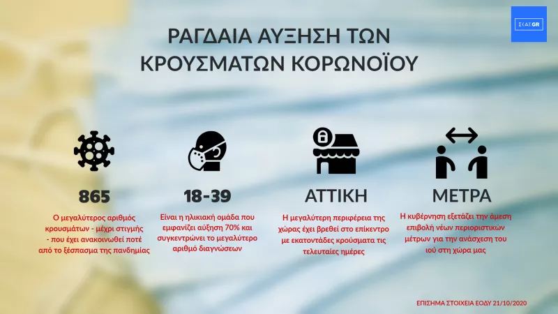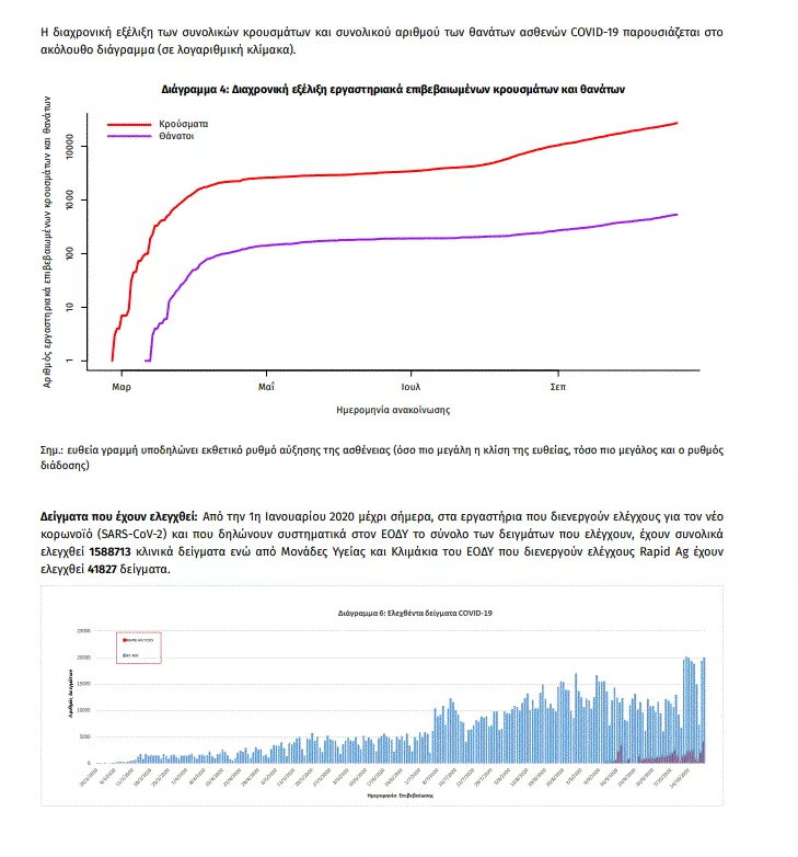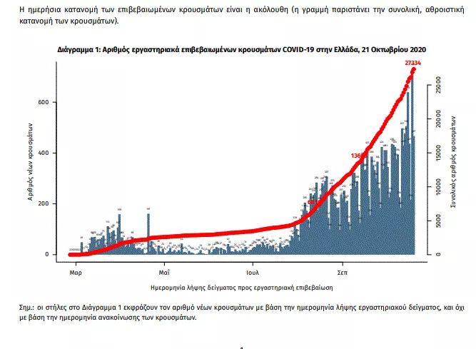 Τα νέα εργαστηριακά επιβεβαιωμένα κρούσματα κορωνοιού στην Ελλάδα είναι 865, εκ των οποίων 82 συνδέονται με γνωστές συρροές και 44 εντοπίστηκαν κατόπιν ελέγχων στις πύλες εισόδου της χώρας. Ο συνολικός αριθμός των κρουσμάτων ανέρχεται σε 27334 (ημερήσια μεταβολή +3.3%), εκ των οποίων 55.6% άνδρες.
