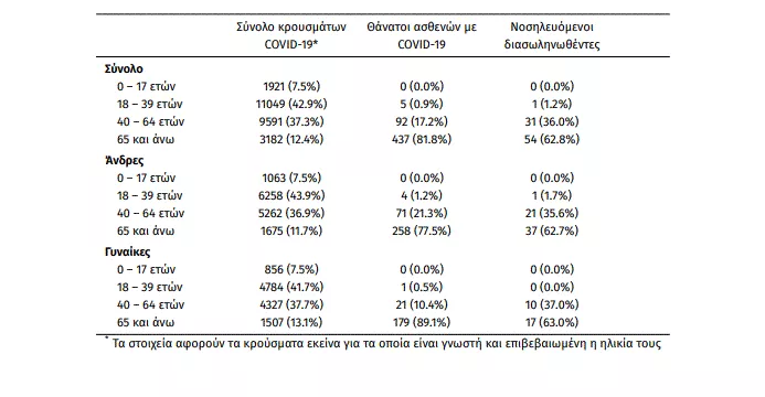 Η μέση ηλικία των κρουσμάτων είναι 39 έτη (εύρος 0 έως 102 ετών), ενώ η μέση ηλικία των θανάτων είναι 79 έτη (εύρος 25 έως 102 ετών). Η ηλικιακή κατανομή των (α) συνολικών κρουσμάτων, (β) των περιστατικών που κατέληξαν σε θάνατο και (γ) των ασθενών που νοσηλεύονται διασωληνωμένοι, είναι η ακόλουθη: