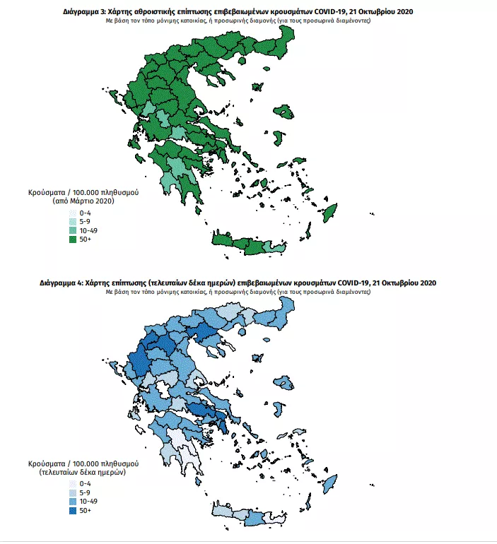 Ο χάρτης αποτυπώνει τη γεωγραφική κατανομή των συνολικών κρουσμάτων COVID-19 (από την αρχή της επιδημίας) ανά Περιφερειακή Ενότητα της χώρας, με βάση την δηλωθείσα διεύθυνση μόνιμης κατοικίας του ασθενούς, ή τη διεύθυνση προσωρινής διαμονής για τους τουρίστες και άλλους προσωρινά διαμένοντες στην Ελλάδα. Συμπεριλαμβάνονται τόσο κρούσματα με ιστορικό ταξιδίου (“εισαγόμενα”) όσο και κρούσματα με πιθανή εγχώρια μετάδοση.