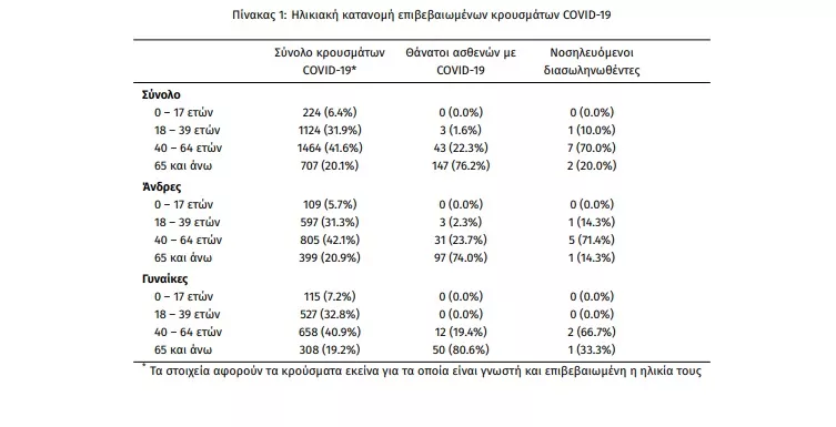 Η μέση ηλικία των κρουσμάτων είναι 47 έτη (εύρος 0 έως 102 ετών), ενώ η μέση ηλικία των θανάτων είναι 76 έτη (εύρος 35 έως 102 ετών). Η ηλικιακή κατανομή των (α) συνολικών κρουσμάτων, (β) των περιστατικών που κατέληξαν σε θάνατο και (γ) των ασθενών που νοσηλεύονται διασωληνωμένοι, είναι η ακόλουθη: