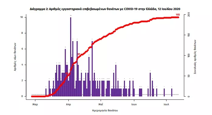 Τέλος, δεν έχει καταγραφεί κανένας νέος θάνατος ενώ έχουμε 193 θανάτους συνολικά στη χώρα. 62 (32.1%) γυναίκες και οι υπόλοιποι άνδρες. Η διάμεση ηλικία των θανόντων συμπολιτών μας ήταν τα 76 έτη και το 95.9% είχε κάποιο υποκείμενο νόσημα ή/και ηλικία 70 ετών και άνω.