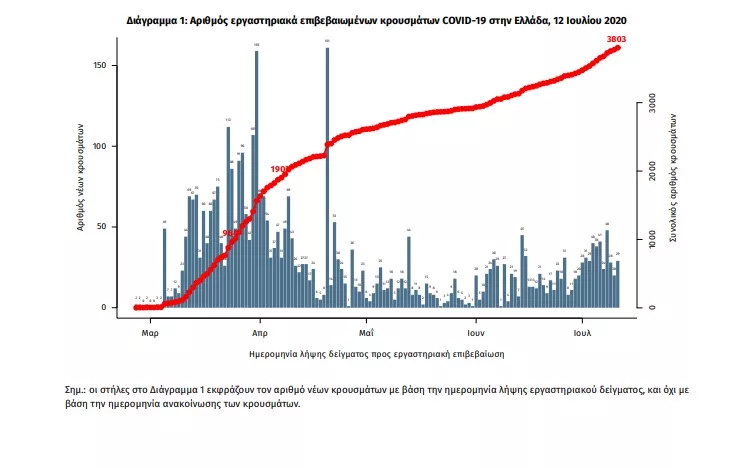 Δείγματα που έχουν ελεγχθεί στα συνεργαζόμενα με τον ΕΟΔΥ εργαστήρια: Από την 1η Ιανουαρίου 2020 μέχρι σήμερα, στα εργαστήρια που διενεργούν ελέγχους για τον νέο κορωνοϊό (SARS-CoV-2) και που δηλώνουν συστηματικά στον ΕΟΔΥ το σύνολο των δειγμάτων που ελέγχουν (θετικά και αρνητικά), έχουν συνολικά ελεγχθεί 373932 κλινικά δείγματα, εκ των οποίων τα 5961 (1.6%) ήταν θετικά στον κορωνοϊό (συμπεριλαμβάνονται και περισσότερα από ένα δείγματα ανά άτομο που ελέγχθηκε). Από το ανωτέρω σύνολο δειγμάτων, τα 41316 (11.0%) αφορούν δειγματοληψίες σε εισερχόμενες αεροπορικές πτήσεις (από τις 12 Ιουνίου). Εξ’αυτών τα 84 (0.2%) θετικά στον κορωνοϊό.