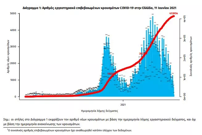 Τα νέα εργαστηριακά επιβεβαιωμένα κρούσματα της νόσου που καταγράφηκαν τις τελευταίες 24 ώρες είναι 791, εκ των οποίων 1 εντοπίστηκε κατόπιν ελέγχων στις πύλες εισόδου της χώρας. Ο συνολικός αριθμός των κρουσμάτων ανέρχεται σε 413.954