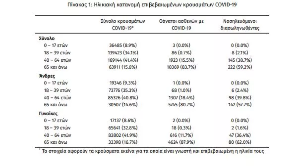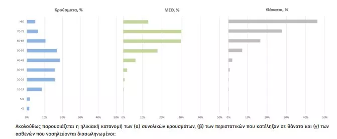 Ο αριθμός των ασθενών που νοσηλεύονται διασωληνωμένοι είναι 375 (65.5% άνδρες). Η διάμεση ηλικία τους είναι 67 έτη. To 86.9% έχει υποκείμενο νόσημα ή/και ηλικία 70 ετών και άνω. Από την αρχή της πανδημίας έχουν εξέλθει από τις ΜΕΘ 2.549 ασθενείς. Οι εισαγωγές νέων ασθενών Covid-19 στα νοσοκομεία της επικράτειας είναι 119 (ημερήσια μεταβολή +16.67%). Ο μέσος όρος εισαγωγών του επταημέρου είναι 128 ασθενείς. Η διάμεση ηλικία των κρουσμάτων είναι 43 έτη (εύρος 0.2 έως 106 έτη), ενώ η διάμεση ηλικία των θανόντων είναι 78 έτη (εύρος 0.2
