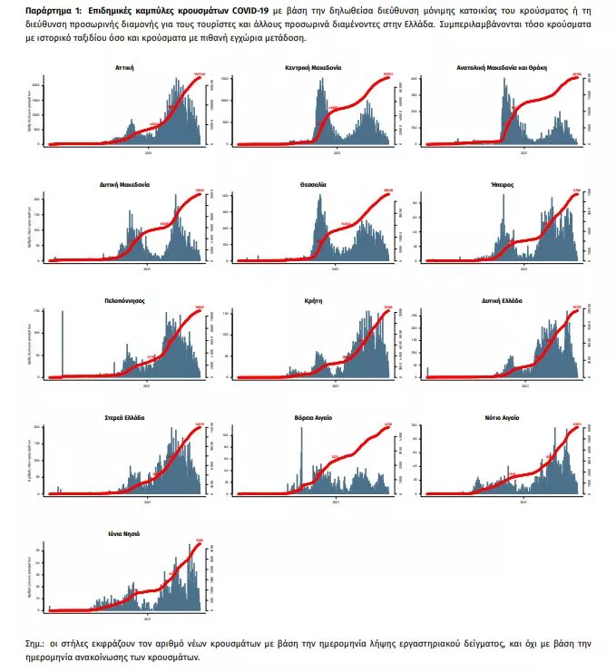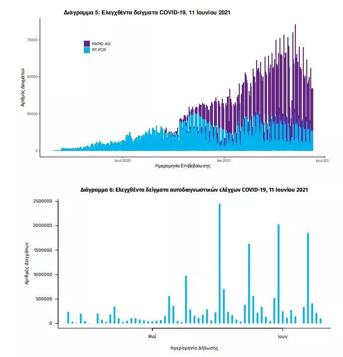 Δείγματα που έχουν ελεγχθεί: Από την 1η Ιανουαρίου 2020 μέχρι σήμερα, στα εργαστήρια που διενεργούν ελέγχους για τον νέο κορωνοϊό (SARS-CoV-2) και που δηλώνουν συστηματικά το σύνολο των δειγμάτων που ελέγχουν, έχουν συνολικά ελεγχθεί 5.219.105 κλινικά δείγματα ενώ από Μονάδες Υγείας και Κλιμάκια του ΕΟΔΥ που διενεργούν ελέγχους Rapid Ag έχουν ελεγχθεί 4.775.214 δείγματα. O μέσος όρος του επταημέρου είναι 38.981 δειγματοληπτικοί έλεγχοι.