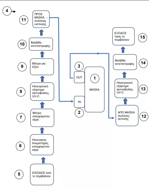 Συγκεκριμένα, ο εισπνεόμενος αέρας πριν εισέλθει εσωτερικά στη μάσκα, φιλτράρεται με ειδικό αντικαθιστούμενο φίλτρο ενεργού άνθρακα και μετέπειτα εκτίθεται σε υπεριώδη ακτινοβολία μέσω του προσαρτημένου συστήματος σκοτώνοντας τα ανεπιθύμητα μικρόβια, ιούς και άλλα παθογόνα για τα οποία η υπεριώδης ακτινοβολία είναι θανατηφόρα. Επιπροσθέτως κατά την έξοδο του από τη συσκευή και λίγο πριν την είσοδο του στην μάσκα, διέρχεται από ειδικό φίλτρο για παρακράτηση των υπολειμμάτων των νεκρών μικροβίων και ιών. Με τον ίδιο τρόπο αποστειρώνεται και ο εκπνεόμενος αέρας, ο οποίος με διαφορετική πορεία φτάνει στην ολοκληρωμένη αυτόνομη μονάδα επεξεργασίας εισπνεόμενου και εκπνεόμενου αέρα. Εκτός από τα νοσοκομεία προορίζεται για χρήση σε χώρους τύπου «ISO Cleanroom», καθώς και όπου υπάρχει ανάγκη προστασίας από μολυσματικούς παράγοντες.