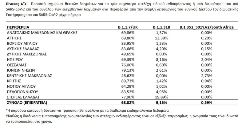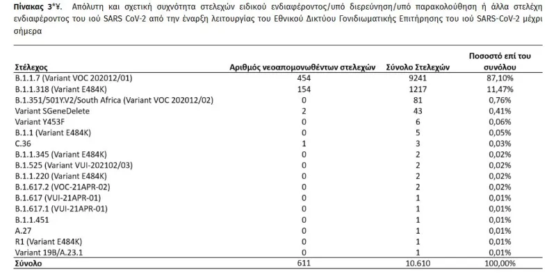 Από την έναρξη λειτουργίας του Εθνικού Δικτύου Γονιδιωματικής Επιτήρησης του ιού SARS-CoV-2 μέχρι σήμερα έχουν ελεγχθεί στην επικράτεια συνολικά 13.289 δείγματα από εγχώρια κρούσματα, εκ των οποίων τα τρία πιο συχνά στελέχη ειδικού ενδιαφέροντος ή υπό διερεύνηση που έχουν απομονωθεί είναι το Β.1.1.7/UK lineage (Variant VOC 202012/01), με ποσοστό 68,82%, ακολουθούμενο από το B.1.1.318 (Variant E484K) με ποσοστό 9,16% και το B.1.351/501Y.V2/South Africa (Variant VOC 202012/02) με ποσοστό 0,59%.