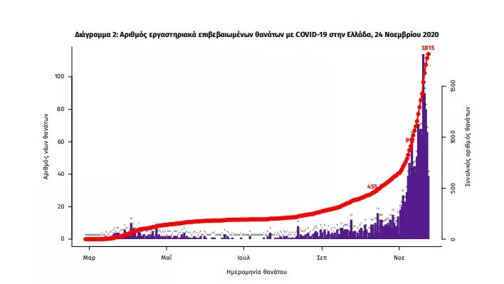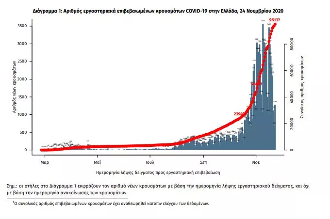 Τα στοιχεία που παρουσιάζονται αφορούν περιστατικά από την επιδημιολογική επιτήρηση της νόσου από το νέο κορωνοϊό (COVID19), με βάση τα δεδομένα που έχουν δηλωθεί στον ΕΟΔΥ και καταγραφεί μέχρι τις 24 Νοεμβρίου 2020 (ώρα 15:00).Τα νέα εργαστηριακά επιβεβαιωμένα κρούσματα της νόσου είναι 2135, εκ των οποίων 13 εντοπίστηκαν κατόπιν ελέγχων στις πύλες εισόδου της χώρας. Ο συνολικός αριθμός των κρουσμάτων ανέρχεται σε 95137 (ημερήσια μεταβολή +2.3%), εκ των οποίων 53.3% άνδρες. 1 Οι νέοι θάνατοι ασθενών με COVID-19 είναι 101, ενώ από την έναρξη της επιδημίας έχουν καταγραφεί συνολικά 1815 θάνατοι.Η διάμεση ηλικία των ασθενών που απεβίωσαν είναι 80 έτη. Ο αριθμός των ασθενών που νοσηλεύονται διασωληνωμένοι είναι 562 (71.4% άνδρες). Η ημερήσια κατανομή των επιβεβαιωμένων κρουσμάτων είναι η ακόλουθη (η γραμμή παριστάνει την συνολική, αθροιστική κατανομή των κρουσμάτων).