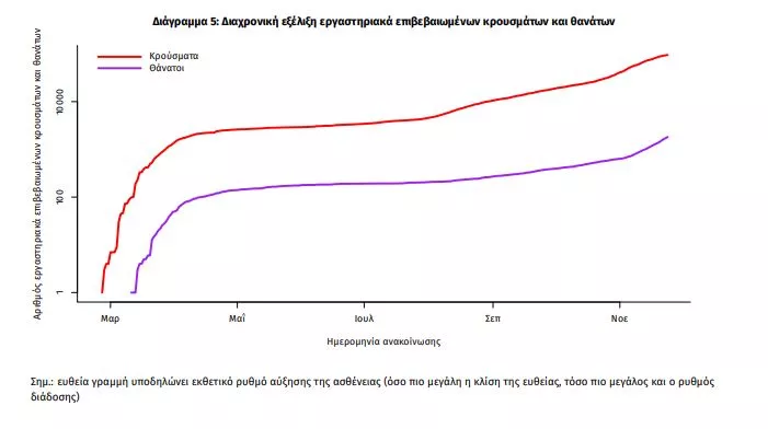 Η διαχρονική εξέλιξη των συνολικών κρουσμάτων και συνολικού αριθμού των θανάτων ασθενών COVID-19 παρουσιάζεται στο ακόλουθο διάγραμμα (σε λογαριθμική κλίμακα).