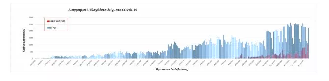 Δείγματα που έχουν ελεγχθεί: Από την 1η Ιανουαρίου 2020 μέχρι σήμερα, στα εργαστήρια που διενεργούν ελέγχους για τον νέο κορωνοϊό (SARS-CoV-2) και που δηλώνουν συστηματικά στον ΕΟΔΥ το σύνολο των δειγμάτων που ελέγχουν, έχουν συνολικά ελεγχθεί 2269298 κλινικά δείγματα ενώ από Μονάδες Υγείας και Κλιμάκια του ΕΟΔΥ που διενεργούν ελέγχους Rapid Ag έχουν ελεγχθεί 166834 δείγματα.