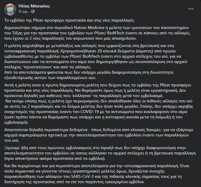 Αυτό επισημαίνει σε ανάρτησή του στο Facebook ο καθηγητής Πολιτικής της Υγείας Ηλίας Μόσιαλος της Σχολής Οικονομικών και Πολιτικών Επιστημών του Λονδίνου (LSE). Η μελέτη ασχολήθηκε με μεταλλάξεις και αλλαγές που εμφανίζονται στη βρετανική και στη νοτιοαφρικανική παραλλαγή. Χρησιμοποιήθηκαν 20 κλινικά δείγματα αίματος από πρώην εμβολιασθέντες με το εμβόλιο των Pfizer/BioNTech έναντι στο αρχικό στέλεχος του ιού, για να διαπιστώσουν εάν τα αντισώματα στο αίμα που δημιουργήθηκαν ως ανοσοαπόκριση στο αρχικό στέλεχος, «προστατεύουν» και από τις αλλαγές.