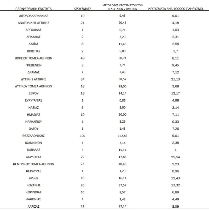 Στην Αττική καταγράφηκαν 172 νέα κρούσματα και στη Θεσσαλονίκη 100. Στην Δυτική Αττική, συγκεκριμένα, σημειώθηκαν 34 νέα κρούσματα.
