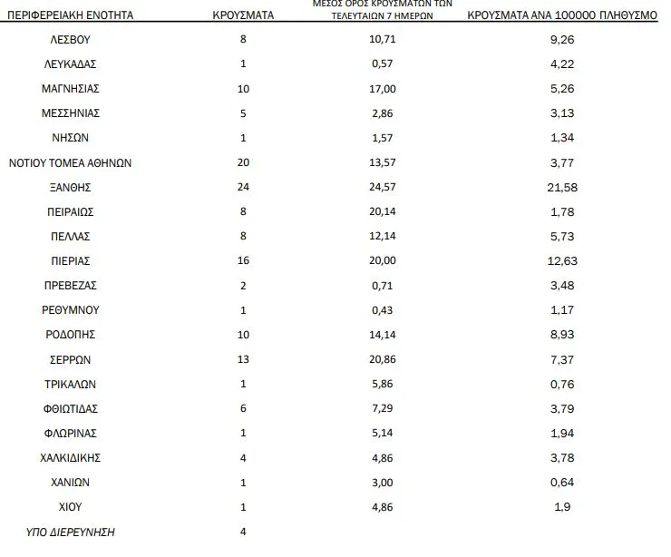 Τα 5211 κρούσματα (4.0%) θεωρούνται σχετιζόμενα με ταξίδι από το εξωτερικό και 38349 (29.3%) είναι σχετιζόμενα με ήδη γνωστό κρούσμα.